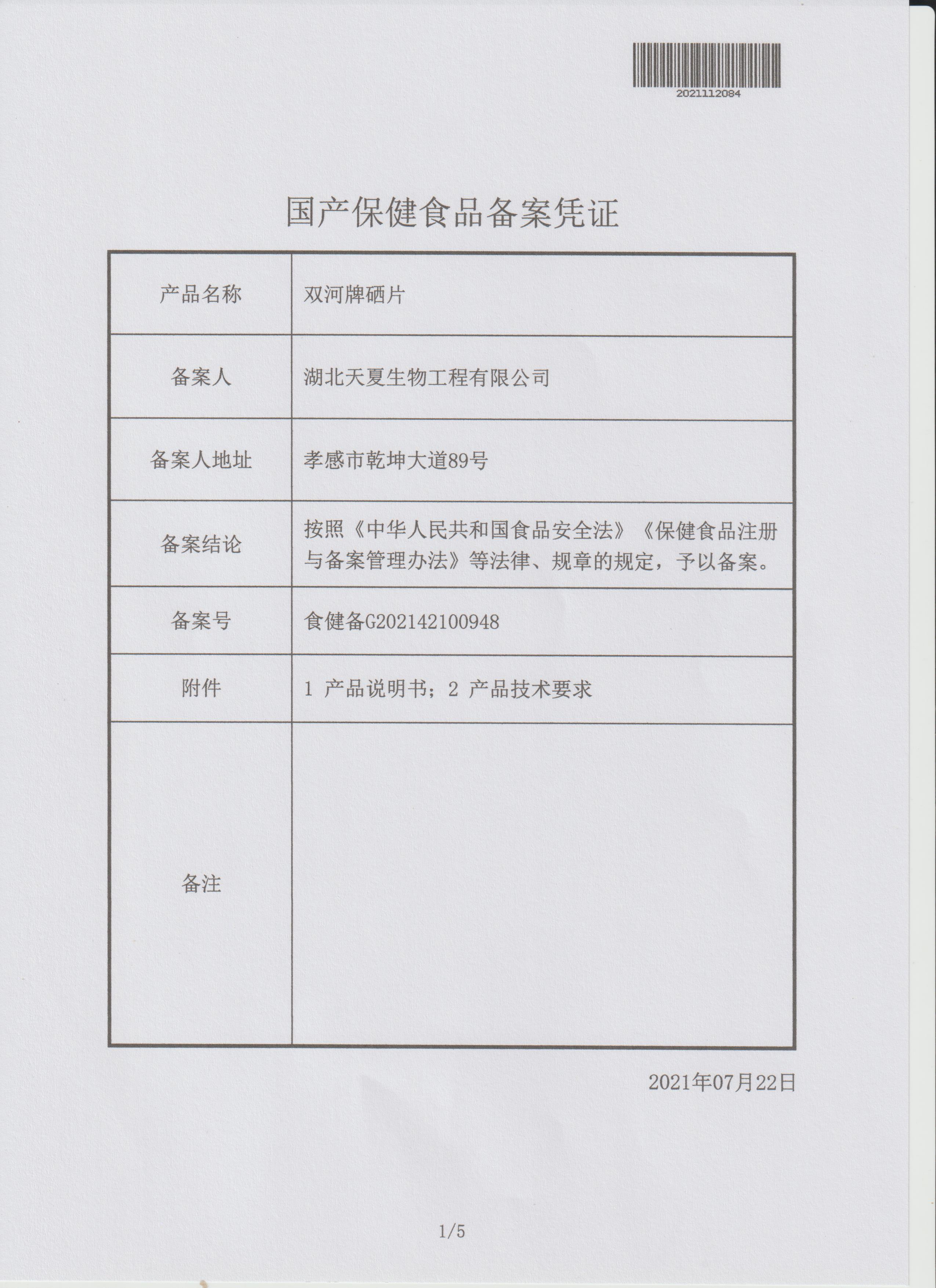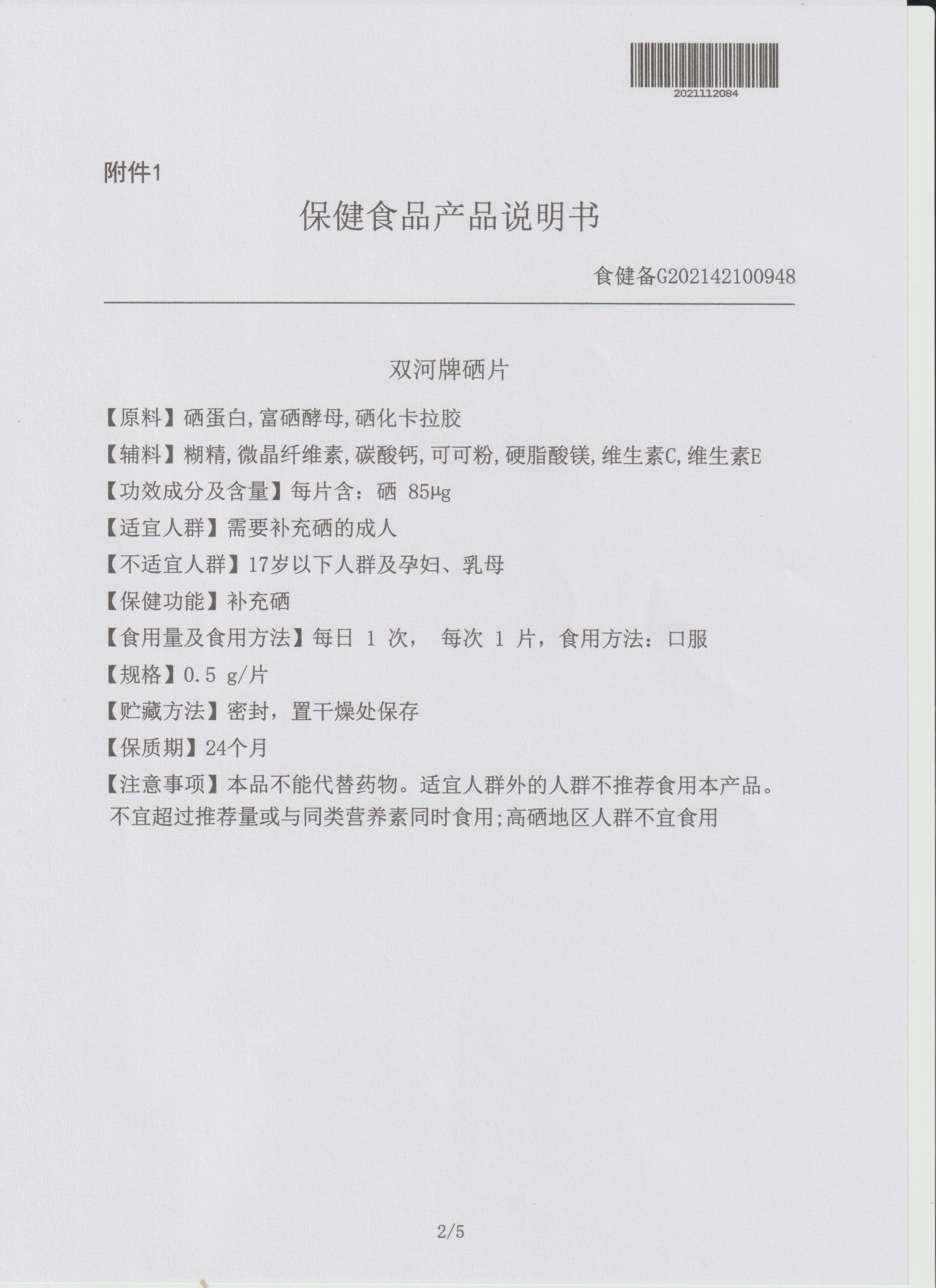 祝賀雙河牌硒片榮獲國家市場監督管理局保健食品批文(食健備G202142100948)。