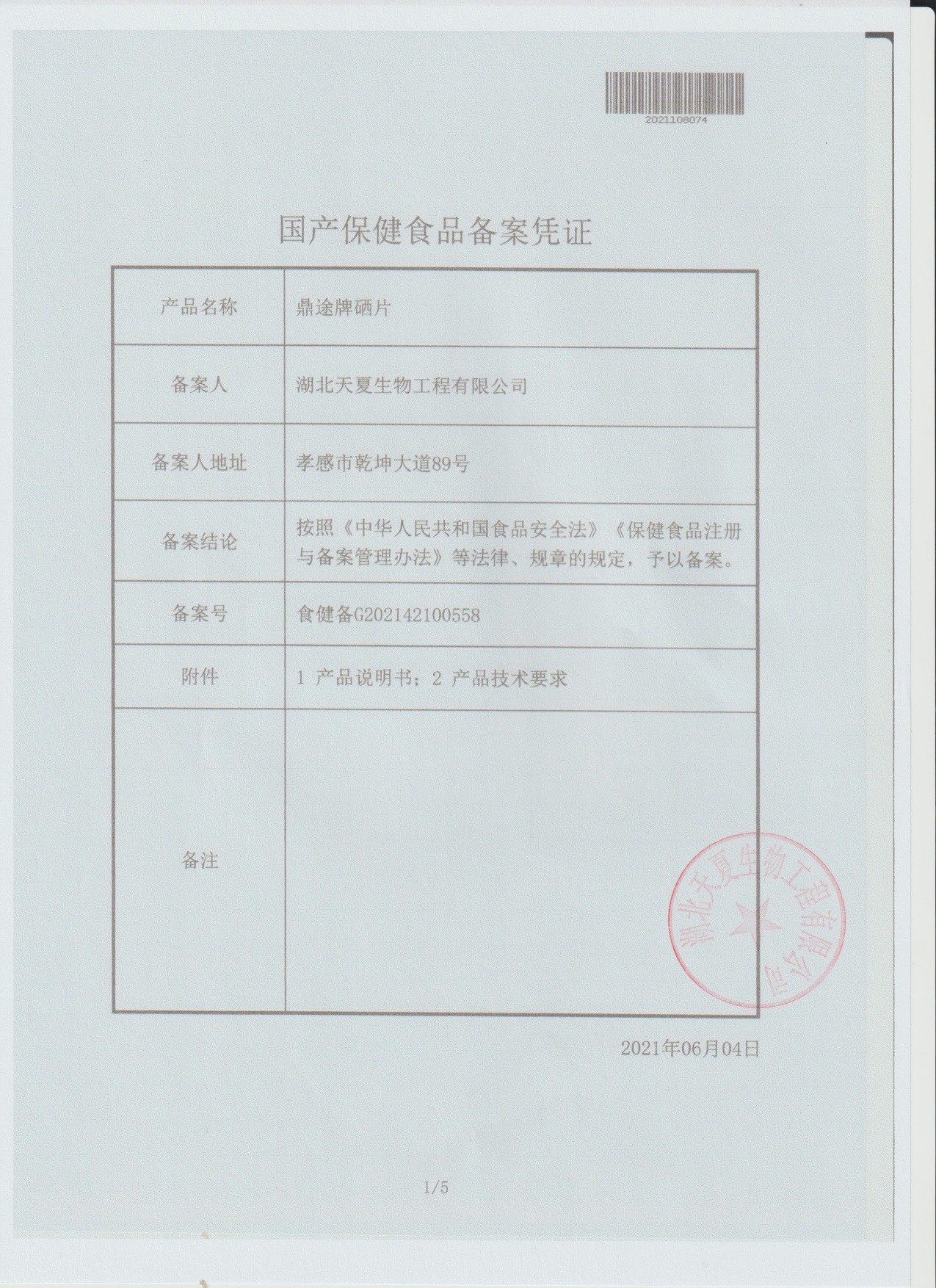湖北天夏生物工程(cheng)有限公司技(ji)術攻(gong)關項目,以二款第四代有機(ji)硒(xi)(xi)(xi)(硒(xi)(xi)(xi)蛋白(bai)和(he)富(fu)硒(xi)(xi)(xi)酵母(mu))雙硒(xi)(xi)(xi)融合、雙硒(xi)(xi)(xi)同補的鼎途牌硒(xi)(xi)(xi)片(pian)榮(rong)獲國家市場監(jian)督管理局保(bao)健食(shi)品批文!食(shi)健備G202142100558