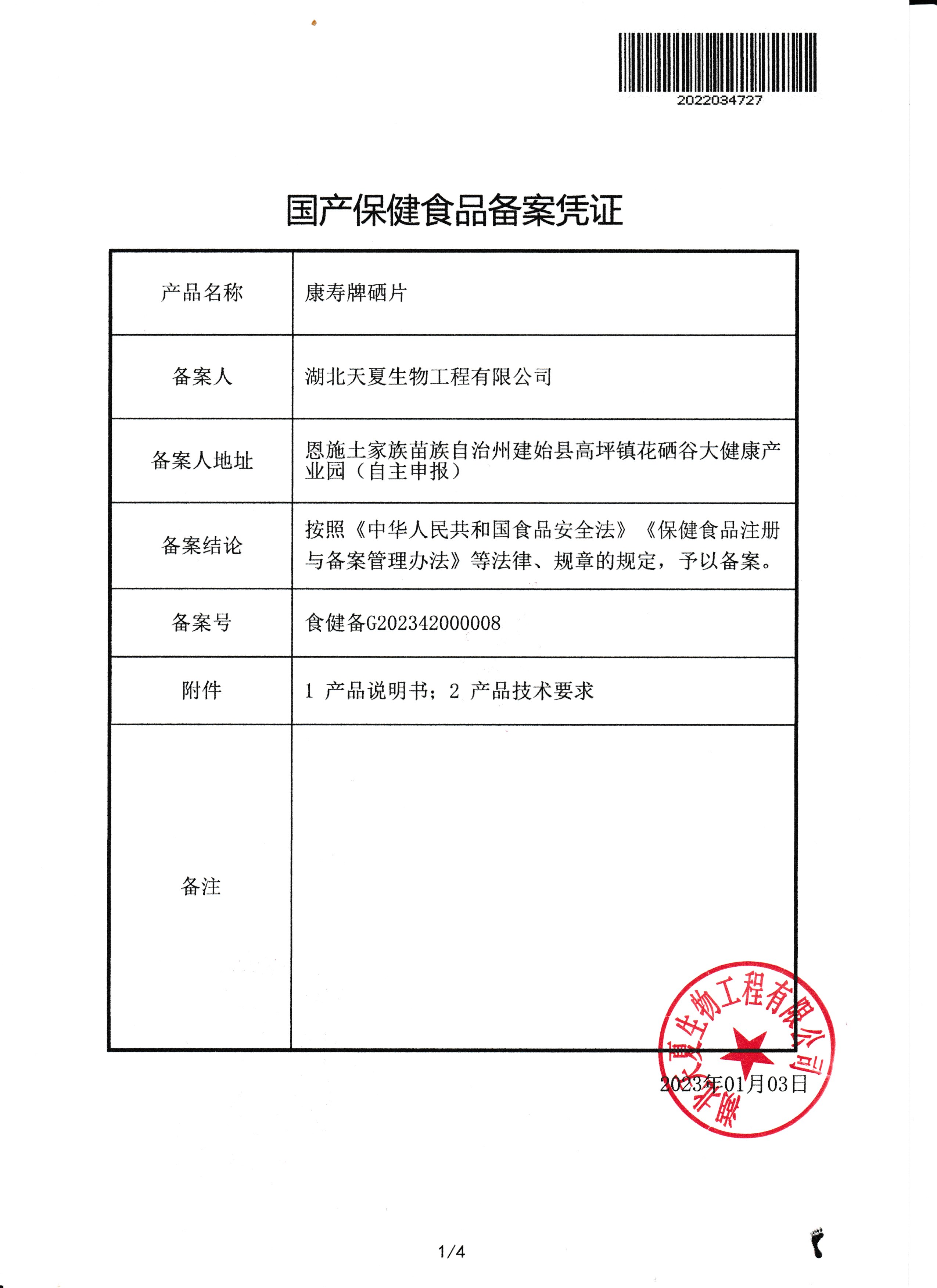 湖北天夏生物工程有限公司最新研發的高含量、純植物硒片“康壽牌硒片”獲得市場監督管理局保健食品備案批準: