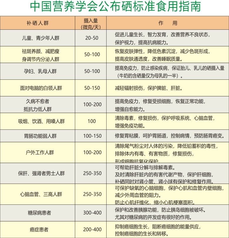 我(wo)國(guo)(guo)著名營養(yang)學專家(jia)于(yu)若木(mu)指出,目前當務之(zhi)急是要做好(hao)(hao)兩件事:一(yi)是各種媒體(ti)應(ying)當普及宣(xuan)傳(chuan)硒(xi)(xi)與人(ren)(ren)體(ti)健(jian)康的(de)知識;二是著手開發與生產富硒(xi)(xi)食品。這(zhe)是關(guan)系億萬人(ren)(ren)民健(jian)康的(de)大事,應(ying)當像補碘那樣抓好(hao)(hao)補硒(xi)(xi)工作。因此,中國(guo)(guo)營養(yang)學會將硒(xi)(xi)列為(wei)15種每(mei)日膳食營養(yang)素(su)之(zhi)一(yi),加以特別推薦,每(mei)人(ren)(ren)每(mei)日必(bi)須攝入50——250微克的(de)硒(xi)(xi)。